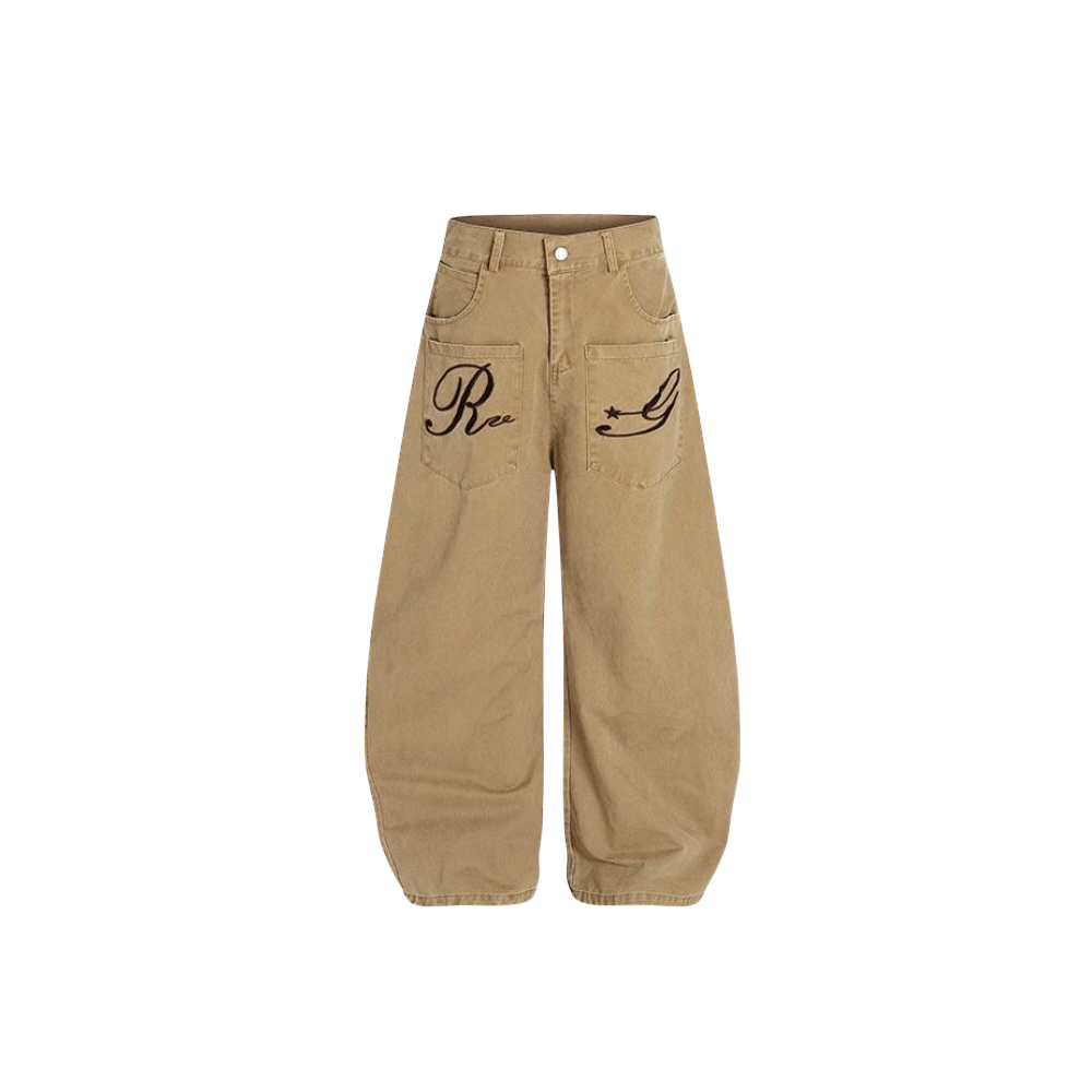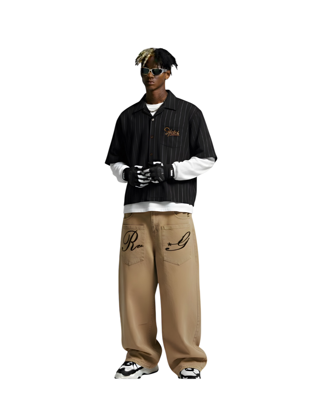 Дээд хэсэгт гүн хар өнгөн дээрх нарийн Pinstripe судал, алтлаг "Hatch" хатгамлаар чимэглэгдсэн Boxy Fitзагварын цамц нь тансаг дитейлийг бүрдүүлнэ. Үүнийг Balloon Cut хэлбэрийн хэт сул уналттай, Stone washугаалттай элсэн бор өнгийн денимтэй хослуулснаар сонирхолтой контраст үүсгэж, жинхэнэ Premium Streetwearмэдрэмжийг төрүүлнэ. Өмдний халаасан дээрх "R" & "G" үсгийн хатгамал нь загварыг улам онцгой болгосон.