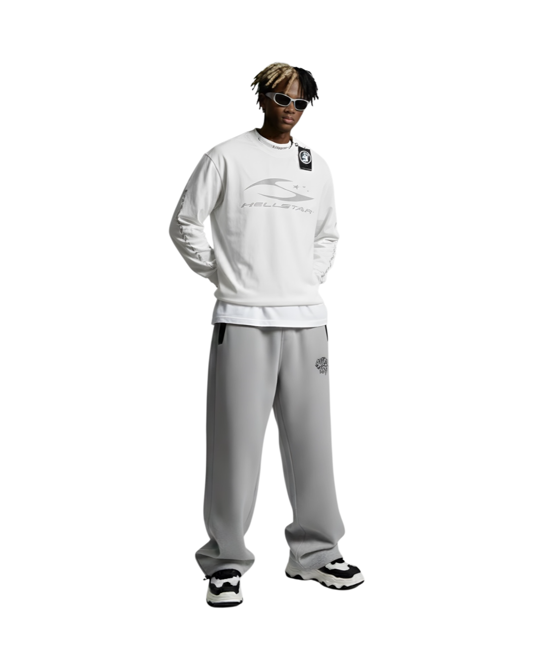 Дээд хэсэгт футуристик HELLSTAR лого болон ханцуйны деталь бүхий Relaxed Fit загварын цагаан цамц нь цэгцтэй, цэвэрхэн High-street төрхийг бүрдүүлнэ. Үүнийг Extreme Baggy загварын цайвар саарал өмдтэй хослуулсан нь чөлөөт байдлыг дээд зэргээр илэрхийлэх бөгөөд өмдний хар контраст халаас, "Street art" лого болон шулуун эсвэл боолттой болгож өөрчлөх боломжтой тохируулгатай (toggle cuffs) уяа нь загварлаг шийдлийг нэмж өгнө.