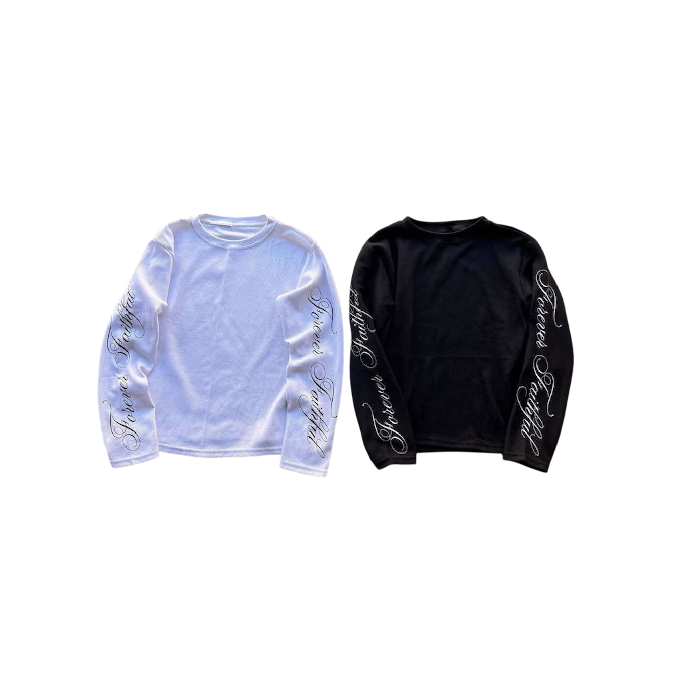 Минималист атлаа хүчирхэг утга агуулга бүхий "Forever Faithful" бичиглэлтэй урт ханцуйтай цамцнууд. Хоёр ханцуйн дагуу байрлах готик хэв маягтай скрипт бичээс нь streetwear болон орчин үеийн "Gothic Aesthetic" соёлын нэгдлийг харуулах бөгөөд таны хувцаслалтыг илүү нарийн мэдрэмжтэй, "cool" болгож өгнө. Хар болон цагаан өнгийн сонголттой энэхүү загвар нь дангаар нь өмсөхөд цэгцтэй харагдахаас гадна хантааз болон хүрэмний дотор давхарлаж өмсөхөд (Layering) төгс зохицно.