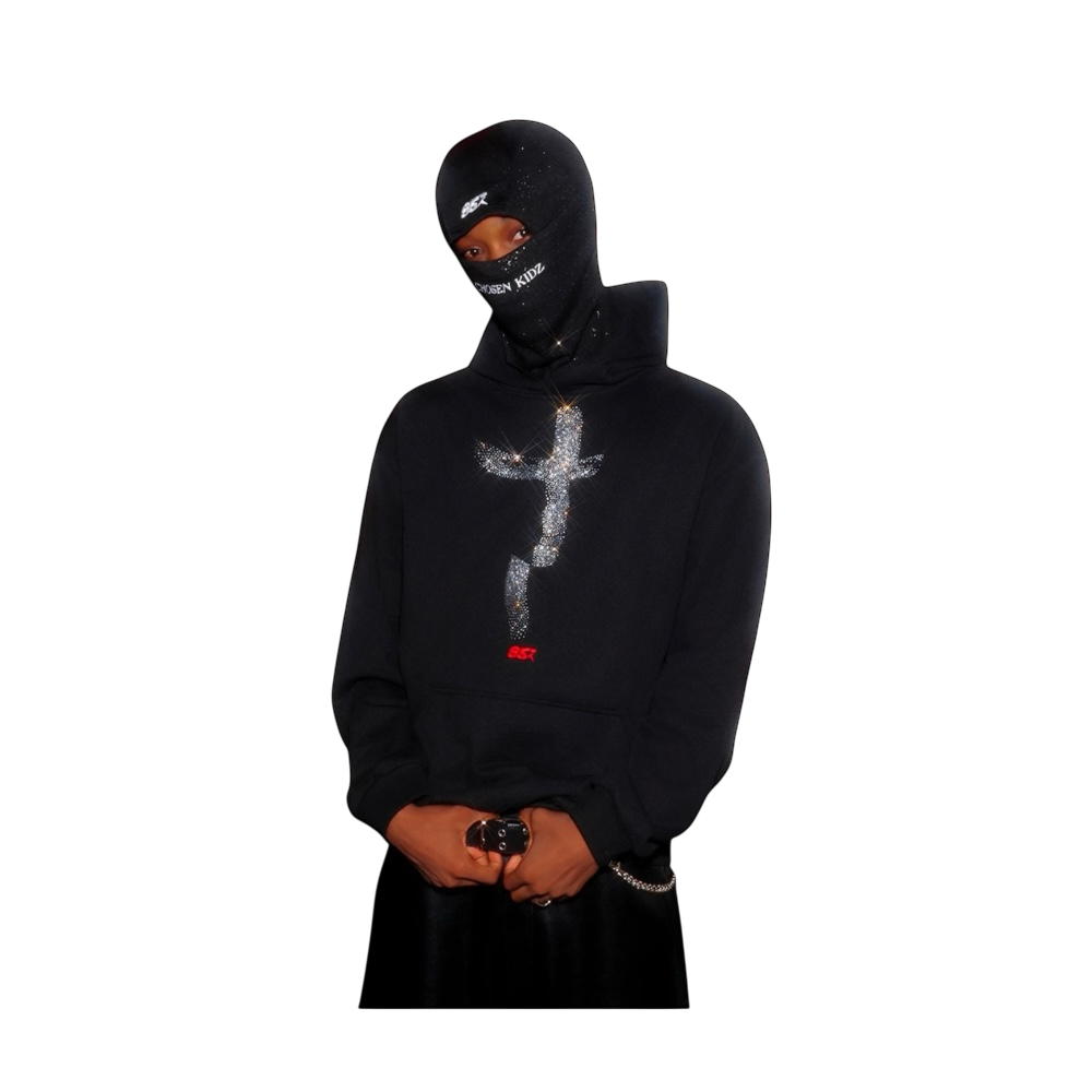 Streetwear болон "Y2K/Trap" соёлын эрч хүчийг илэрхийлсэн, гүн хар өнгийн юүдэнтэй цамц. Цээжин хэсэгт байрлах гялалзсан "Rhinestone" (шилэн шигтгээ) загалмайн деталь нь тансаг бөгөөд "bold" төрхийг бүрдүүлж, гэрэл тусахад амьд мэт гялалзан харагдана. Өргөн мөртэй, чөлөөтэй уналттай (Boxy Oversized Fit) шийдэл нь орчин үеийн хотын стильд төгс зохицож, таныг бусдаас өвөрмөц, загварлаг харагдуулах болно.