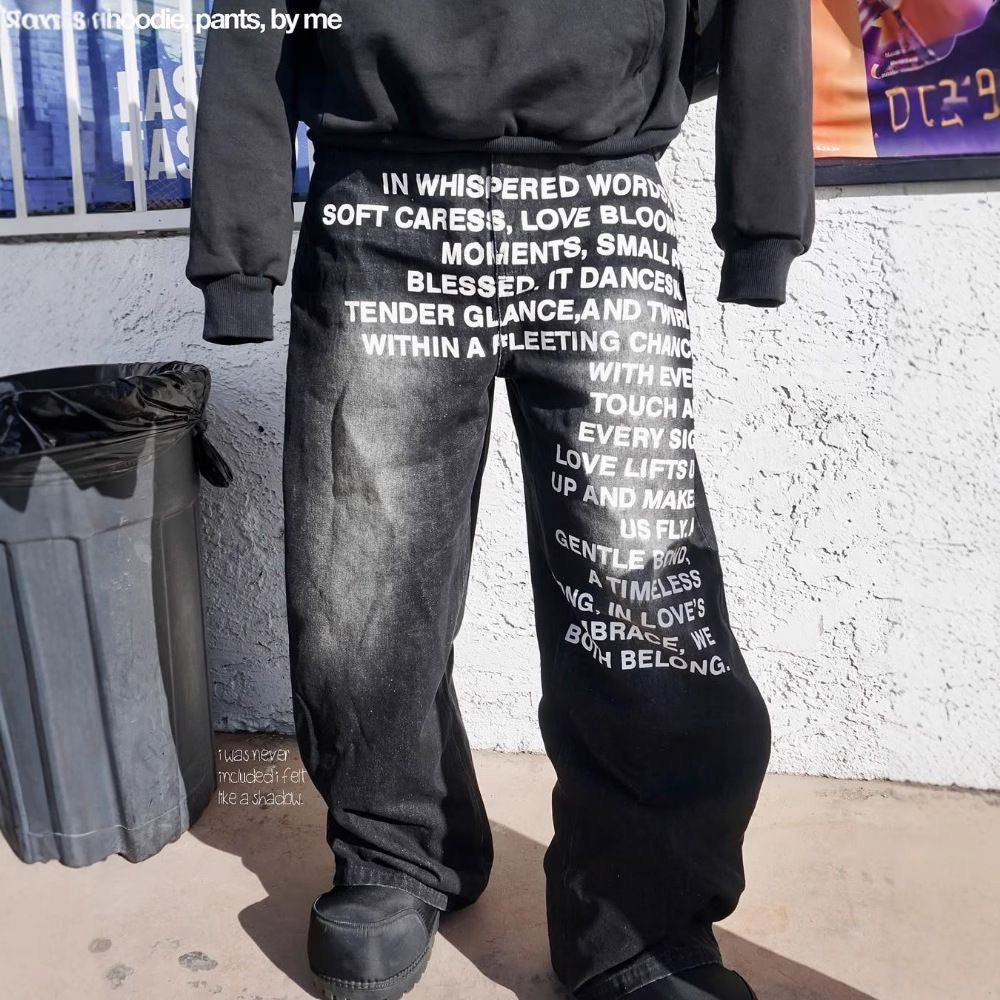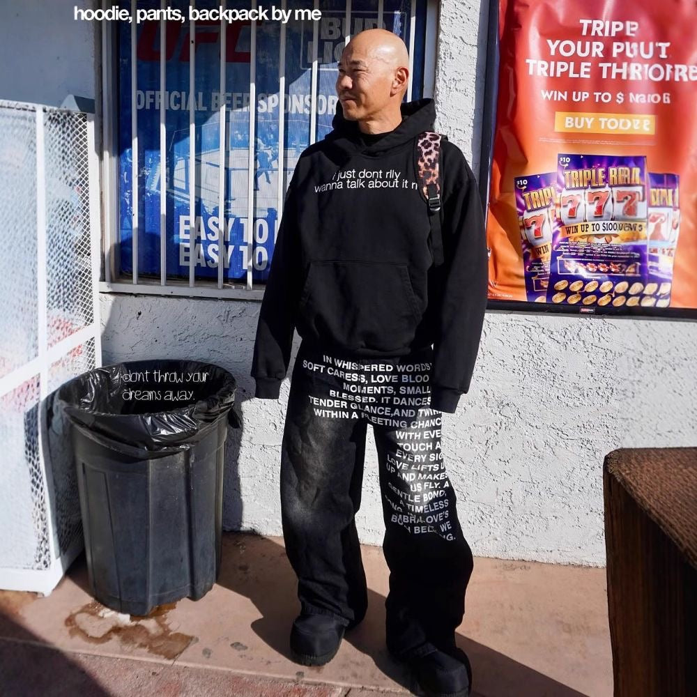 Дээд хэсэгт биеийн галбирыг чөлөөтэй харагдуулах Oversized Fit загварын саарал цамц нь "STRATEGY", "Empty City 98" болон морьтой хүний distressed эффекттэй принүүдээрээ premium бөгөөд хуучинсаг өнгө аясыг бүрдүүлнэ. Үүнийг "Poetry script" буюу өвөрмөц бичвэр бүхий, Extreme Baggy Fit загварын гандсан хар деним өмдтэй хослуулснаар утга учиртай, загварлаг силуэтийг үүсгэв.